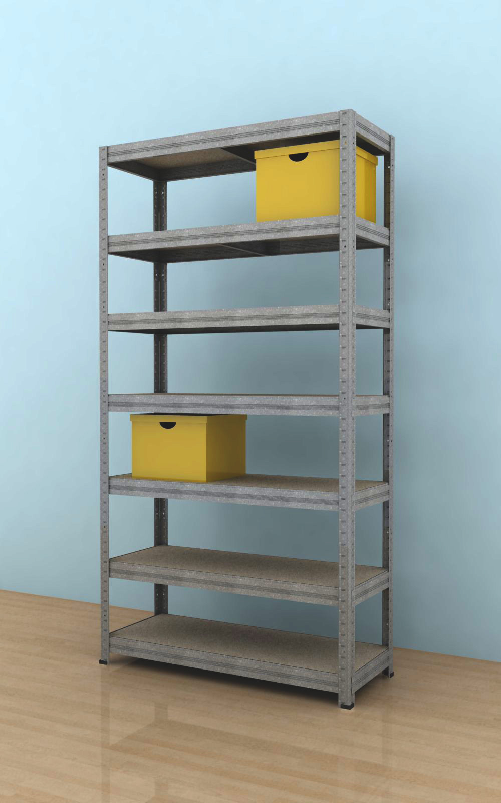V balení regálu je 7 kusů výztuh, které se vkládají pod každou polici. Police jsou vyrobeny ze surové dřevotřískové desky. Vysoce stabilní kovová konstrukce je vyrobena z ocelového plechu.