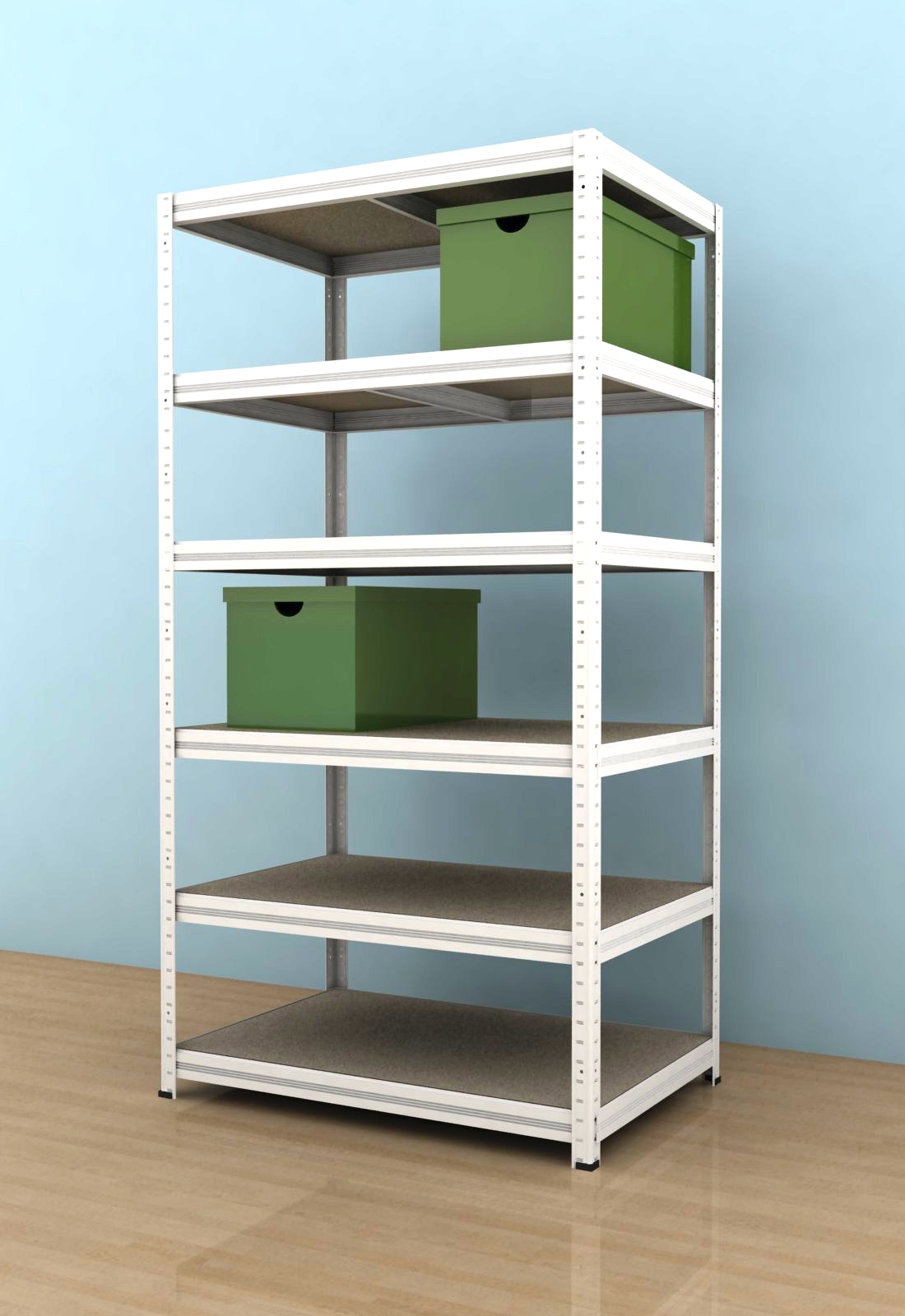 V balení regálu je 6 kusů výztuh, které se vkládají pod každou polici. Police jsou vyrobeny ze surové dřevotřískové desky. Vysoce stabilní kovová konstrukce je vyrobena z ocelového plechu.