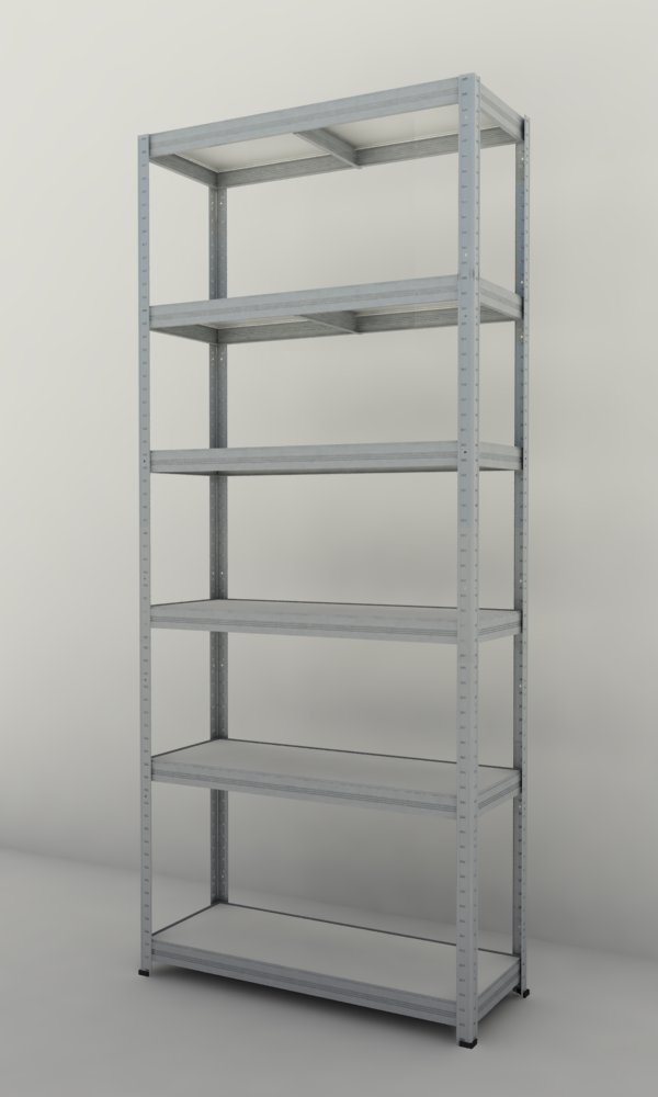 V balení regálu je 6 kusů výztuh, které se vkládají pod každou polici. Police jsou vyrobeny ze surové dřevotřískové desky. Vysoce stabilní kovová konstrukce je vyrobena z ocelového plechu.