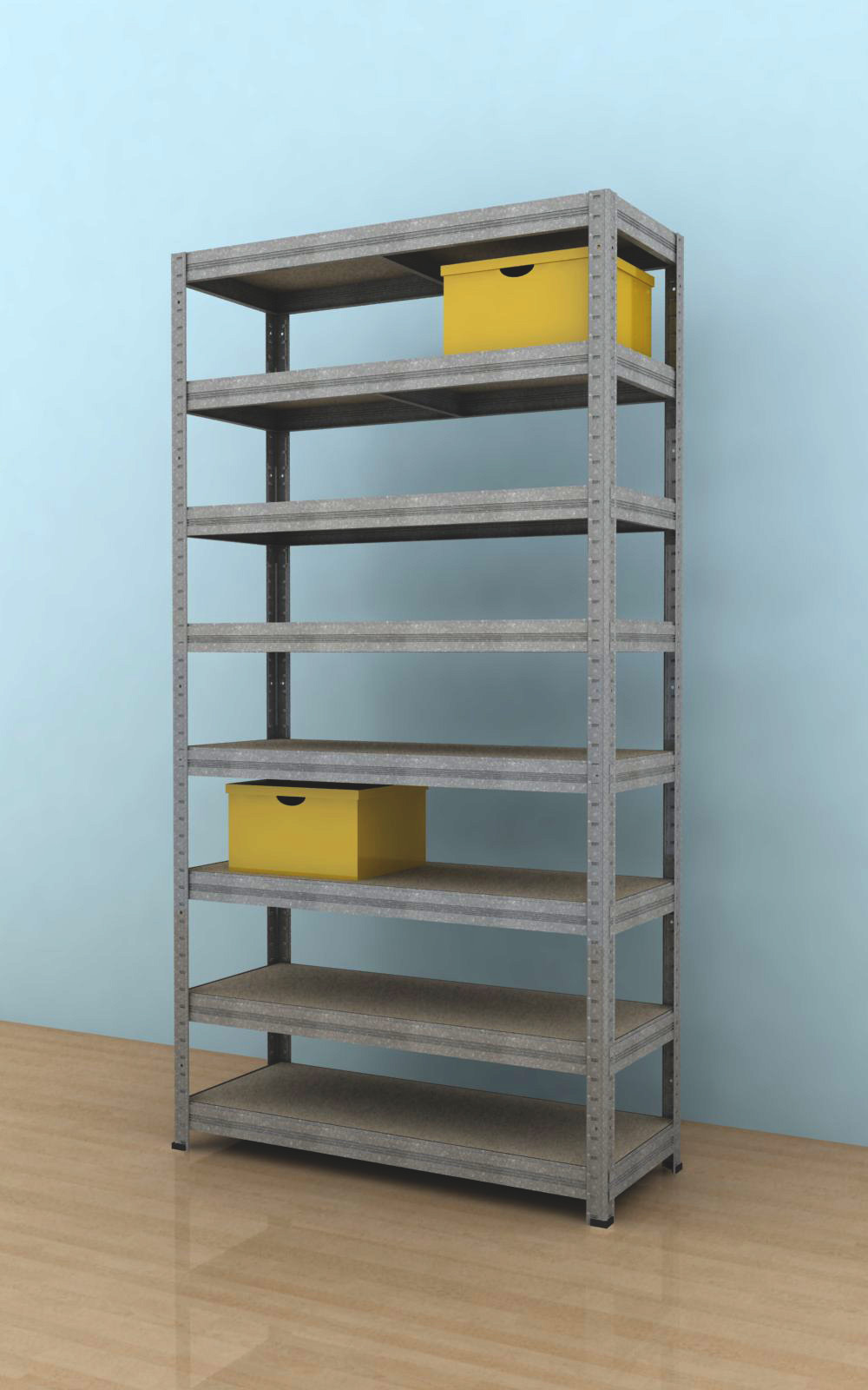 V balení regálu je 8 kusů výztuh, které se vkládají pod každou polici. Police jsou vyrobeny ze surové dřevotřískové desky. Vysoce stabilní kovová konstrukce je vyrobena z ocelového plechu.