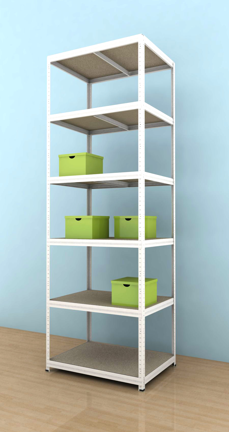 Kovový regál Futur s dřevotřískovými policemi má využití jak v domácnostech ( garáže, sklepy, pracovny, dílny, spíže), tak ve firmách (dílny, sklady, archivy, prodejny) i v kancelářích (archivy, sklady). Skláda se snadno, bez použití šrobů a to díky unikátnímu systému spojování nosníků. Police jsou vyrobeny ze surové dřevotřískové desky. Součástí balení je 6 kusů výztuh, které se vkládají pod každou polici. Vysoce stabilní kovová konstrukce je vyrobena z ocelového plechu. Nosnost regálu je 350kg na jednu polici a výška regálu je 2700 mm. Regál je nutno ukotvit ke zdi.